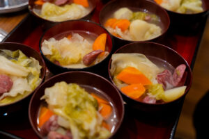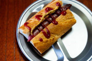 お昼にはジビエソーセージのホットドックと楠田さん特製ジビエのポトフ。そして焼き芋。