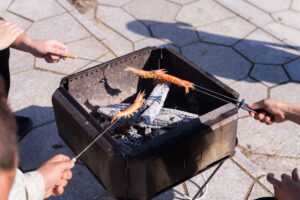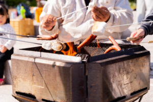 お昼ごはんは、イノシシソーセージとマシュマロのBBQ、焼き芋、竹の飯盒で炊く戸馳島の絶品白米です。車海老も釣れたら食べれるスタイルです。