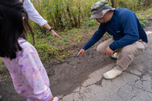 そんな中、道の端に「たぬきの足跡」も発見!たっちゃんが教えてくれました。