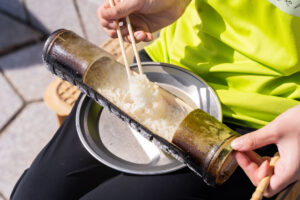 竹の飯盒を使ってお米を炊きます。