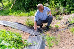 さつまいも畑では、草刈りに加え、動物対策として電気柵と通電シート(マルチシートに電線が編み込まれたもの)を設置しました。