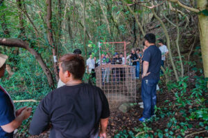 処理の方法として、捕獲して止め刺しした後に、捕獲した場所で1m以上の深さの穴を掘って埋めると定められていますが、機械も入れないような場所に置く罠で、手作業で掘るのは容易ではありません。そのため、土をただかけるだけにとどまるケースが多い実情です。