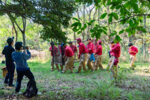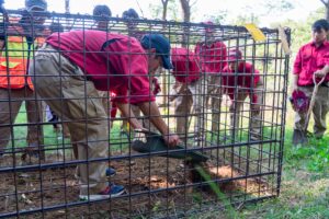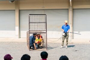 生徒さんと稲葉たっちゃんが“親子イノシシ設定”で箱罠に入り、捕獲の流れを体験しました。