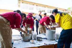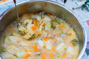 農家ハンターの猪肉を使って、学校の先生が猪汁を作ってくれました。